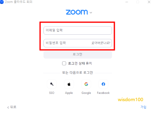 줌 회의방을 개설하려면 위에서 언급했듯이 Zoom 사이트에 가입한 이메일과 비밀번호를 입력하면, 누구나 무료로 회의방을 개설할 수 있다.