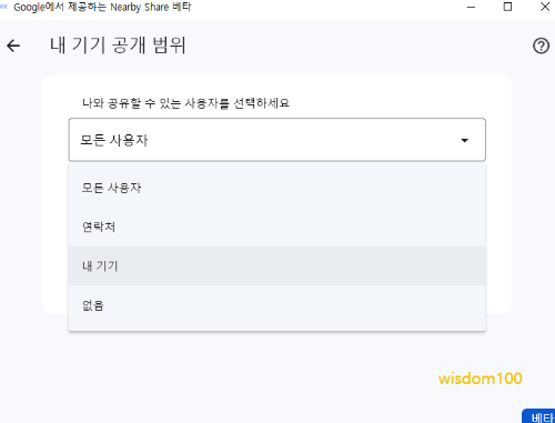 여기에서 기기 이름과 다운로드 위치를 변경할 수 있는데, 중요한 항목은 내 기기 공개 범위이다. 여기에서 컴퓨터 이름을 공개할 대상을 선택할 수 있다. 일반적으로 컴퓨터와 스마트폰 간의 파일 전송은 자신의 기기에서 사용하므로 내 기기를 선택한다. 이렇게 내 기기 간에 사진을 비롯하여 대용량 파일을 전송하려면 동일한 계정으로 로그인을 해야 한다.
