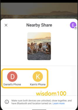 우선, IOS 운영체계 모바일 및 맥용 컴퓨터에서는 니어바이쉐어 프로그램을 사용할 수 없다는 점을 주지해야 한다. 안드로이드 모바일에서 니어바이쉐어는 이미 운영체계 안에 설치되어 있으므로 따로 설치할 필요 없이 바로 사용이 가능하다. 다른 기기에 전송할 콘텐츠를 우선 선택한 후에 하단에 위치한 공유 아이콘을 탭 한다. 그런 다음에 더보기를 눌러서 Nearby Share를 선택한다. 그러면 주변에 공유가 가능한 기기 이름이 나온다.